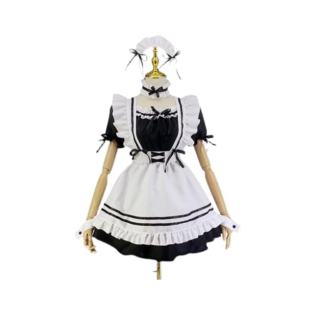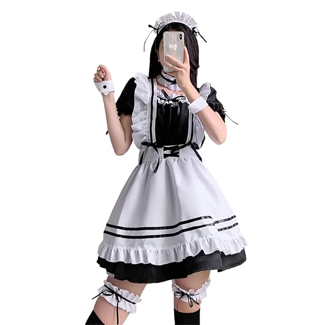 【豪華8点セット】ワンピース(黒)*1点・エプロン(白)*1点・カチューシャ*1点・チョーカー(首)*1点・カフス(腕)*2点・ガーターリング(片太もも)*2点