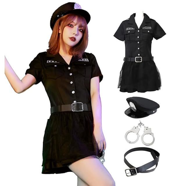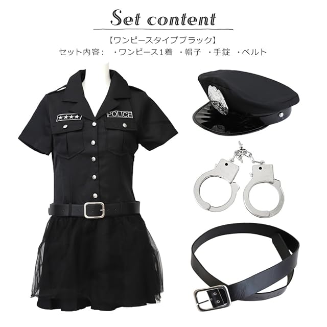 セット内容:【スカートタイプ】セット内容:トップス、スカート、ネクタイ、帽子、手錠、肩紐 【ワンピースタイプ】セット内容:ワンピース1着、帽子、手錠、ベルト