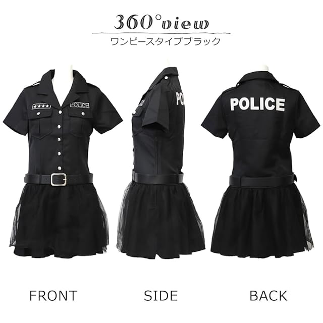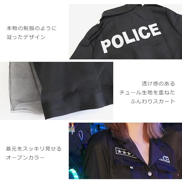商品説明:アメリカンスタイルのポリスコスチューム!ミニスカートが大人っぽい定番のコスチュームです。エンブレム付きの帽子や手錠など、遊べて楽しく、なりきり度がアップするプレイバリューたっぷりな小物付き。ブルー、ホワイト、ブラック、ネイビーの4色展開なのでお友達と揃えて着ても可愛い!
