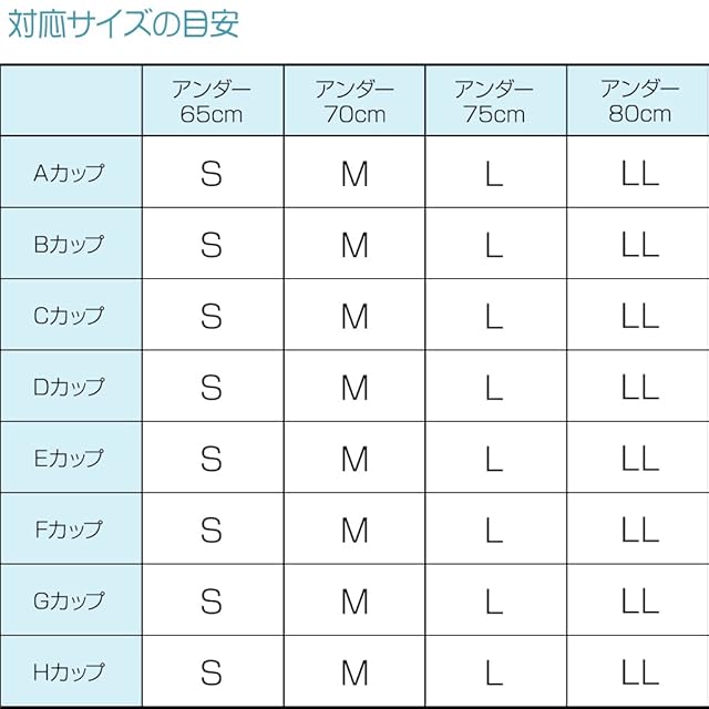 サイズ:S(アンダーバスト63~67cm)・M(アンダーバスト68~72cm)・L(アンダーバスト73~77cm)・LL(アンダーバスト78~82cm)
