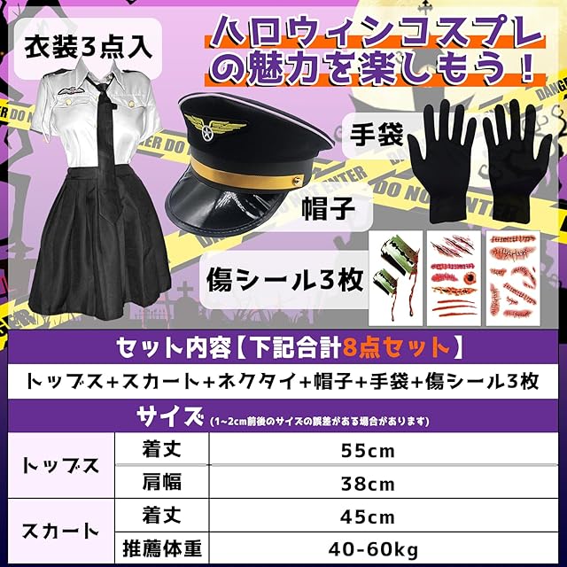 セット内容:ポリス コスプレ 色:ホワイト 9点套 上衣(トッブス)着丈:55cm 肩幅:38cm +(スカート)着丈:45cm +(ネクタイ)+(帽子)+(手袋)+ハロウィン シール*3+トランシーバー型おもちゃ付属