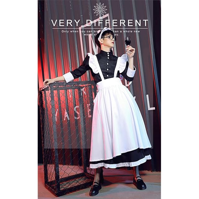 [YUEEI] メイド服 メンズ 男性向け ロングスカート コスプレ ハロウィン 仮装 ワンピース 長袖 可愛い パーティー イベント 撮影 女装 演出服 網タイツ付き 5点セット (M)