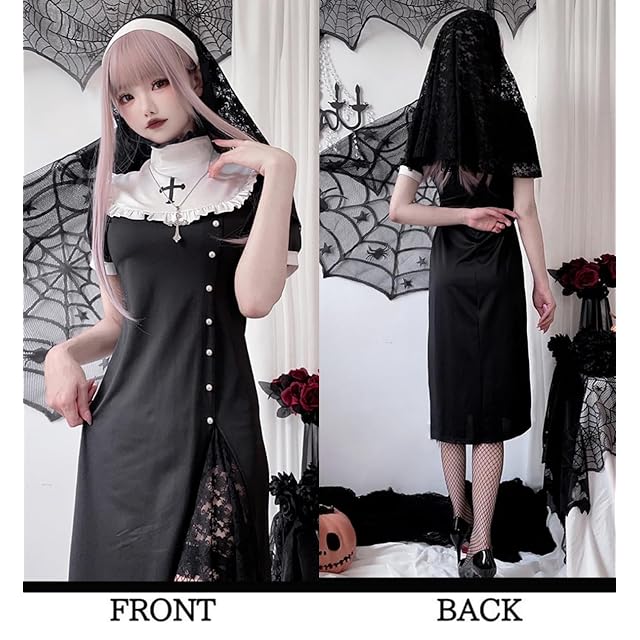 [JUNDOMECY] ハロウィン コスプレ 修道女 シスター 衣装 セクシー 大人 レディース 大きいサイズ 聖歌隊 修道院 教会服 スリット ロングワンピース レース ゴシック 黒 白 ベール 十字架 網タイツ付き イベント 仮装パーティー (M)