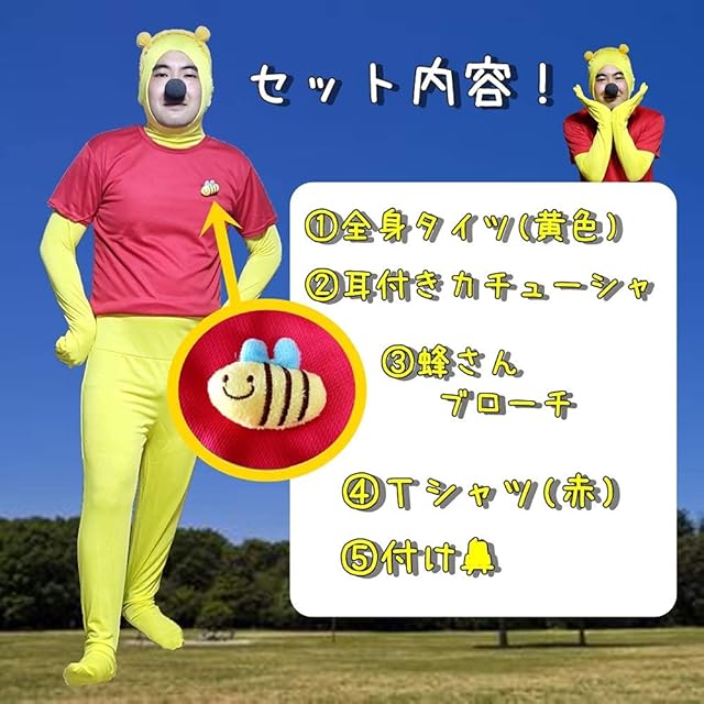 【セット内容】全身タイツ、カチューシャ、シャツ、鼻、ミツバチのブローチ