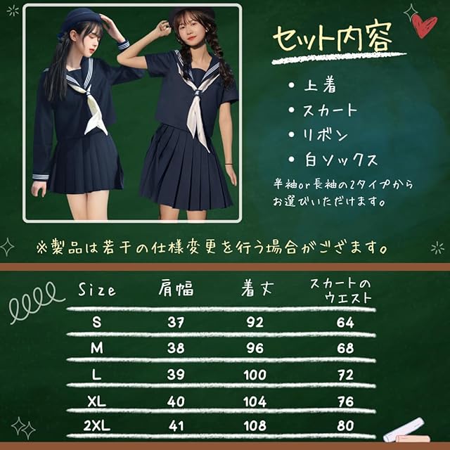 【セーラ服フルセット】上着 / スカート / リボン / 白ソックス 【サイズ】S~2XL(サイズ詳細は商品画像にてご確認ください)