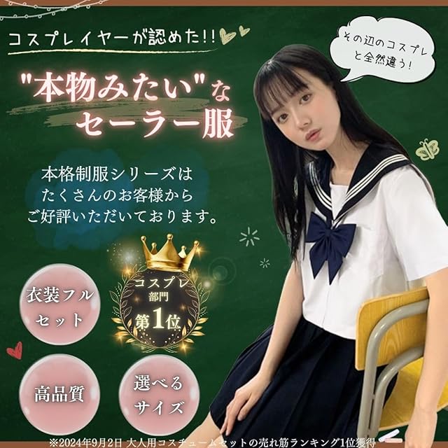 【特徴1】定番のセーラー服を本物のようなクオリティで完全再現!!コスチュームセットがフルセットで、前開きのセーラーはデザインも可愛く着脱がしやすいため大人気です!外さない王道なので、懐かしいあの感じを大人の気分で楽しめます♪