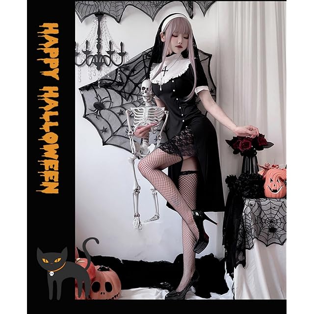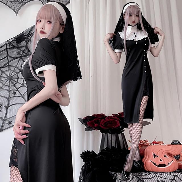 [JUNDOMECY] ハロウィン コスプレ 修道女 シスター 衣装 セクシー 大人 レディース 大きいサイズ 聖歌隊 修道院 教会服 スリット ロングワンピース レース ゴシック 黒 白 ベール 十字架 網タイツ付き イベント 仮装パーティー (XXL)