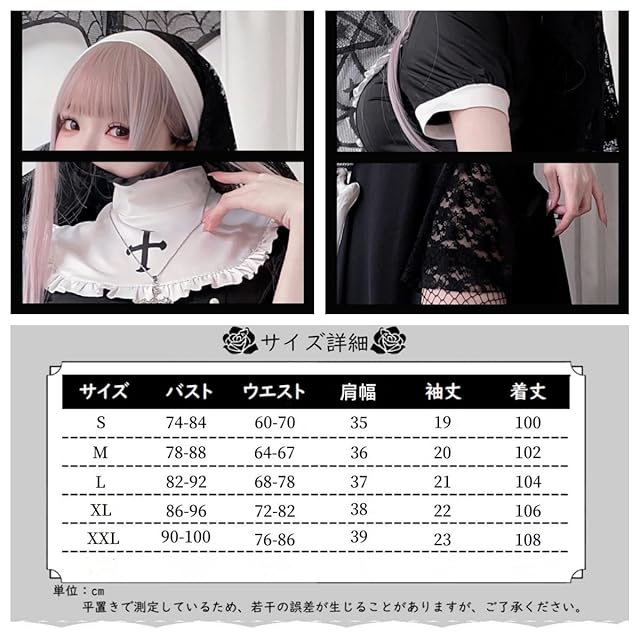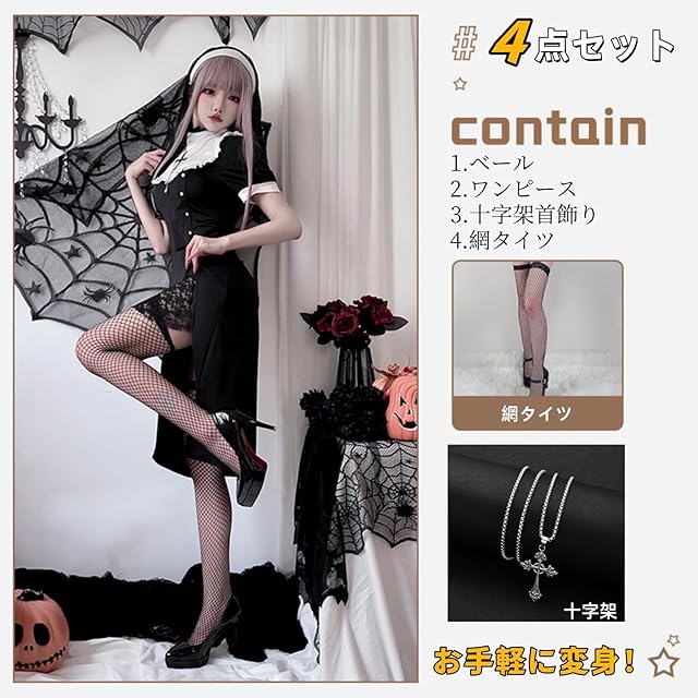 【お得な4点セット】:ワンピース+ベール+十字架++網タイツ;簡単にセクシーで可愛い修道女に変身できます。【 サイズ展開 】S/M/L/XL/XXL(詳細はサイズ表をご参照ください)小さいサイズから大きいサイズまで豊富なサイズ展開!
