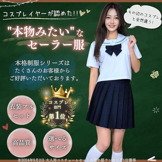 【特徴1】定番のセーラー服を本物のようなクオリティで完全再現!!コスチュームセットがフルセットで、前開きのセーラーはデザインも可愛く着脱がしやすいため大人気です!外さない王道なので、懐かしいあの感じを大人の気分で楽しめます♪