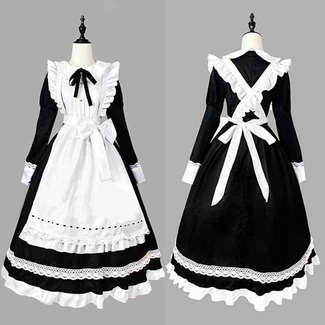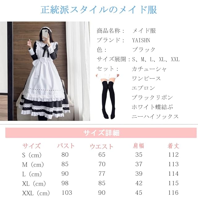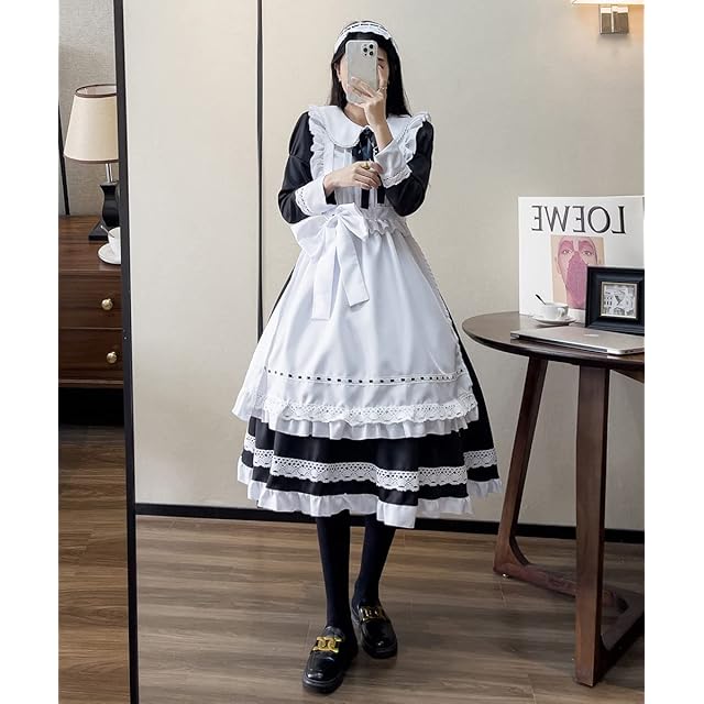 [YAISHN] メイド服 ゴスロリ 可愛い ロリータ 正統 ドレス ロング 人気 ワンピース ハロウィン 仮装 レディース コスプレ 長袖 蝶結ぶ パーティー イベント 演出服 ニーハイソックス カチューシャ 6点セット (XL)