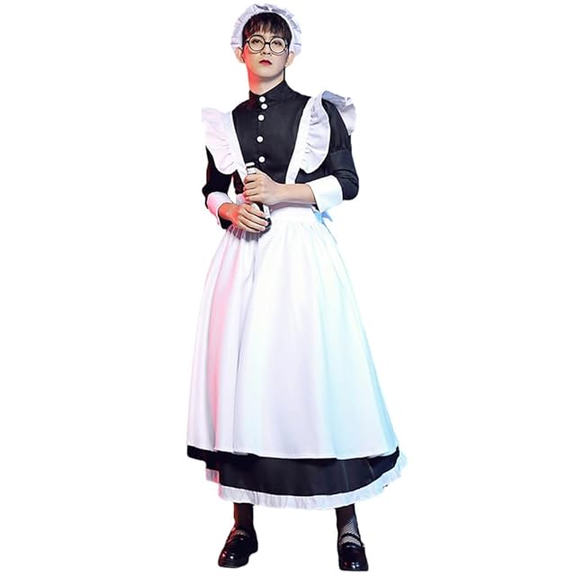 [YUEEI] メイド服 メンズ 男性向け ロングスカート コスプレ ハロウィン 仮装 ワンピース 長袖 可愛い パーティー イベント 撮影 女装 演出服 網タイツ付き 5点セット (2XL)
