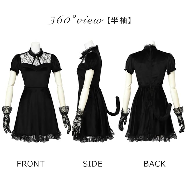 半袖ブラックは、全体的な露出は抑えつつ、透け感のあるレースで上品に肌見せ。また、ベロア調の生地を使用し、上品な艶感で高級感のある仕上がりになっています。ブラック/ホワイトは、全体にレース生地をあしらったデザインが大人っぽくて可愛いスタイル。ふわふわモコモコの付属パーツがとっても可愛く、全体的にキュートな印象です。どちらも魅力的なバリエーションなので、お気に入りのデザインをお選びください!お友達と色違いで着用するのもオススメです。