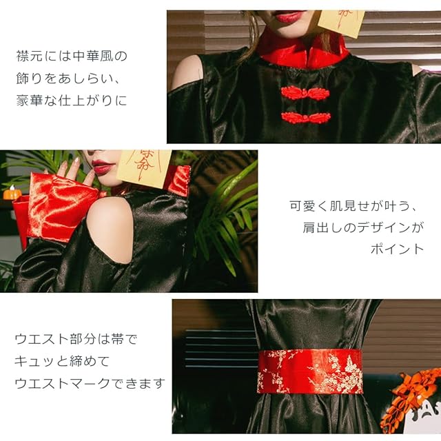 膝丈タイプは、高めの切り替えデザインとスッキリシルエットのスカートでスタイルを良く見せてくれます。また、中華風の飾りと、鎖骨部分が空いたデザインで胸元をオシャレに。レッド・ブルーは、ウエスト部分は帯でキュッと締めてウエストマークできます。襟元には中華風の飾りをあしらい、豪華な仕上がりに。