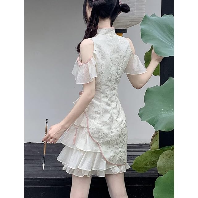 【ニャンコの爪】チャイナドレス セクシー コスプレ ロリータ服 ワンピース 黒い 白い コスチューム ドレス 可愛い かわいい 仮装 (XL, 白い)