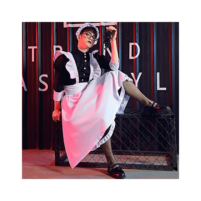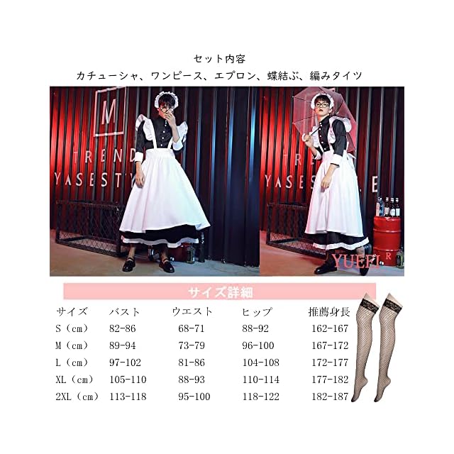 [YUEEI] メイド服 メンズ 男性向け ロングスカート コスプレ ハロウィン 仮装 ワンピース 長袖 可愛い パーティー イベント 撮影 女装 演出服 網タイツ付き 5点セット (S)
