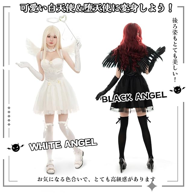 【白天使・黒天使デザイン】:ピュアな白天使とキュートな黒天使、二つの選択肢であなたの異なるパーソナリティを表現します。このエンジェルのコスプレ衣装なら、キュートで魅力的な天使に変装することができます。