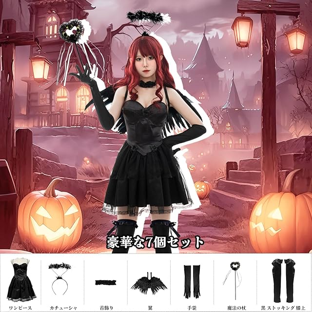 【豊富な7点セット】:ワンピース+カチューシャ+天使の羽+魔法の杖+首飾り+手袋+長い黒靴下 ☆一式揃っているので、可愛い悪魔にすぐコスプレできます。