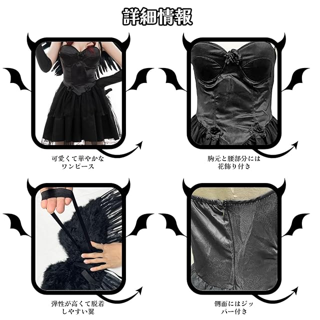 【可愛い感と快適さ】:この黒天使衣装はセクシーなだけでなく、繊細なキャミソールは可愛くて、美少女のようなエネルギッシュさを演出してくれます。また、きちんとした生地は長時間の着用でも快適さをします。