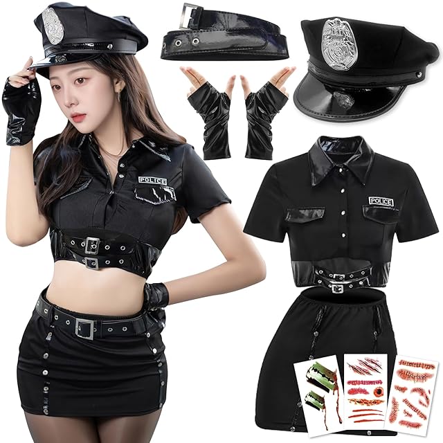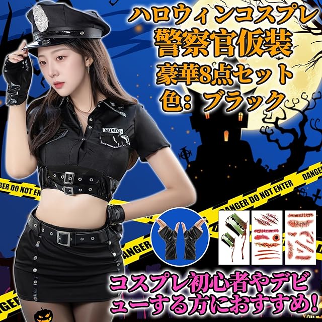 [COZENRE] ポリス コスプレ ハロウィン コスプレ 9点セット 仮装 警察 トップス、プリーツスカート、ネクタイ コスチューム 衣装 婦警 婦人警官 パーティー 仮装 cosplay ハロウィン レディース 色:ブラック