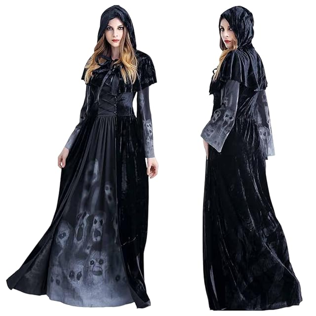 [Formemory] ハロウィン コスプレ 仮装 魔女 悪魔 吸血鬼 レディース コスプレ 衣装 ゴースト 幽霊 2点セット ドレス ブラックネックレスが付き スカルプリント 雰囲気づくり きれい ハロウィン イベント 学園祭 文化祭 演出服 パーティー (S)