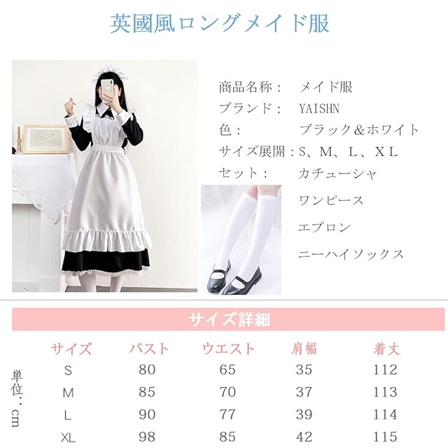 YAISHN メイド服 ロング 英國風 ゴスロリ ワンピース ハロウィン 仮装 レディース 可愛い ロリータ コスプレ 長袖 蝶結ぶ パーティー イベント 演出服 ニーハイソックス付き (S)