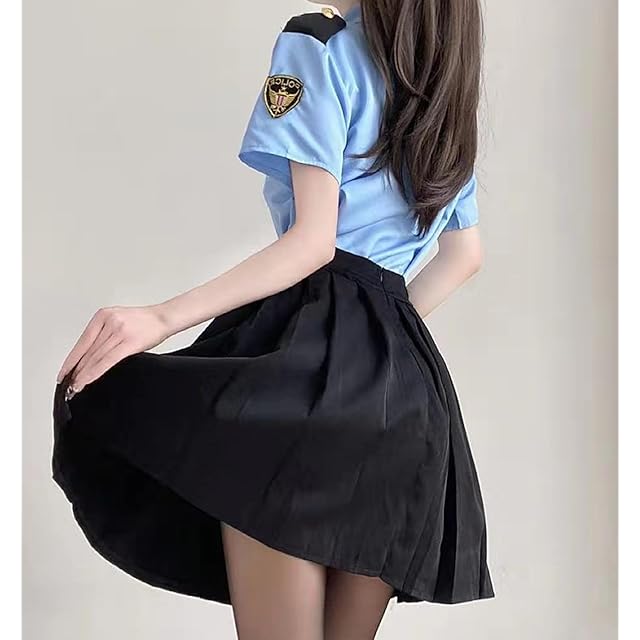[Socpuro] ポリス コスプレ ハロウイン 警察官 コスチューム 【Tシャツ+スカート+ネクタイ+帽子】 4点セット 婦警 仮装 かわいい 制服 セクシー ミニスカート cosplay 婦人警察 衣装 文化祭 ハロウィン 写真 撮影 伸縮性のあるウエスト Fサイズ (ブルー)