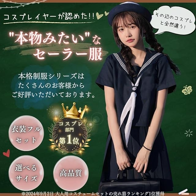 【特徴1】定番のセーラー服を本物のようなクオリティで完全再現!!コスチュームセットがフルセットで、前開きのセーラーはデザインも可愛く着脱がしやすいため大人気です!外さない王道なので、懐かしいあの感じを大人の気分で楽しめます♪