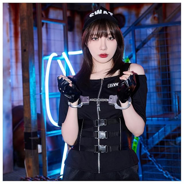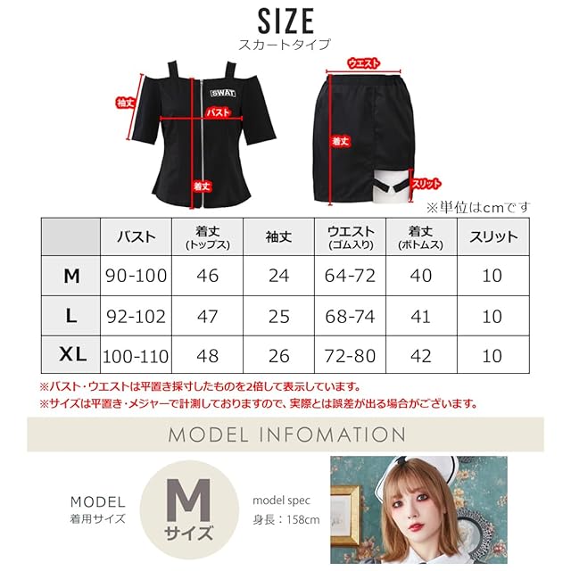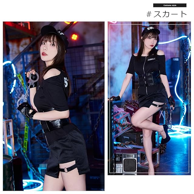 アメリカンスタイルのコスチュームであるSWAT。テーマパークやハロウィンパーティー等で定番になりつつあります。オールブラックコーデが大人っぽくてカッコイイ雰囲気に。手錠や帽子など、本格的で雰囲気たっぷりな小物付き。SWAT衣装の定番の、ベルト付きコルセット風パーツが、スタイル良く見せてくれます。