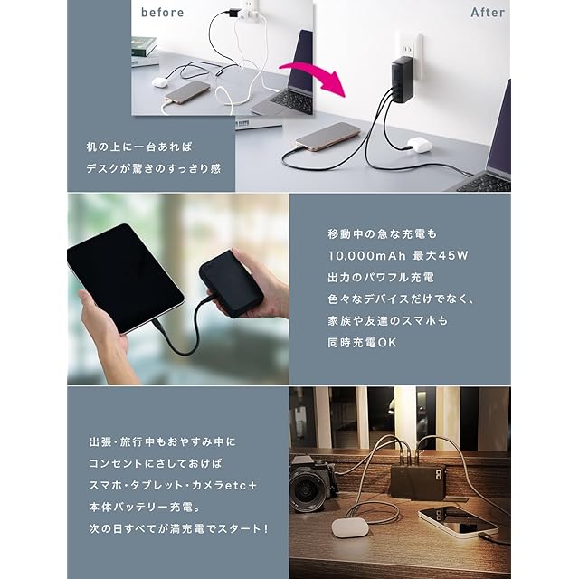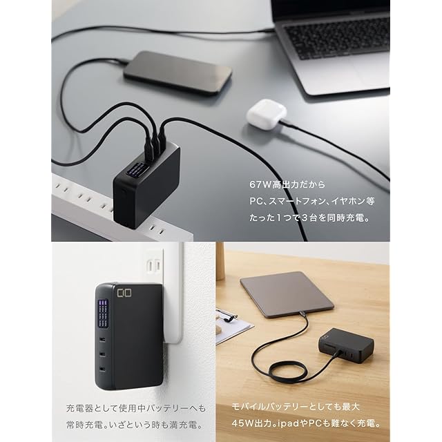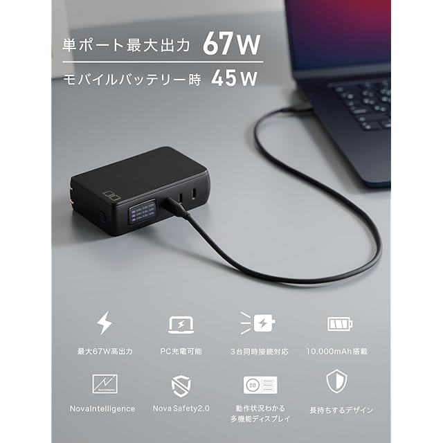 【ACアダプターとモバイルバッテリーが一体化】最大67W出力、タイプCポートを3ポート搭載の急速充電器と、高出力モバイルバッテリーが一体化。コンセントから抜いての使用時も、10000mAhで最大45Wの高出力を実現。外出先でノートパソコンも充電できるモバイルバッテリーです。