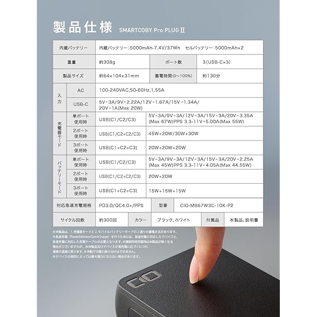 CIO モバイルバッテリー コンセント 一体型 65W 急速充電器 10000mAh Type-C ×3 ノートPC Macbook Windows Android iPhone17 16 SMARTCOBY Pro PLUGⅡ 67W3C【液晶部に保護フィルム有】 (ブラック)