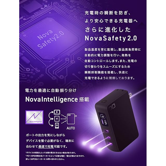 【Nova Intelligence搭載で電力を最適に振り分け】それぞれのUSB タイプC ポートにUSBケーブルを接続するだけで、スマホなどの端末に自動で最大67Wの出力を調整して充電が可能な急速充電器。これまでの充電器のように、接続するUSBポートを迷うことなく最速で充電が可能です。※Nova Intelligenceの仕様は急速充電早見表(画像)をご確認ください。