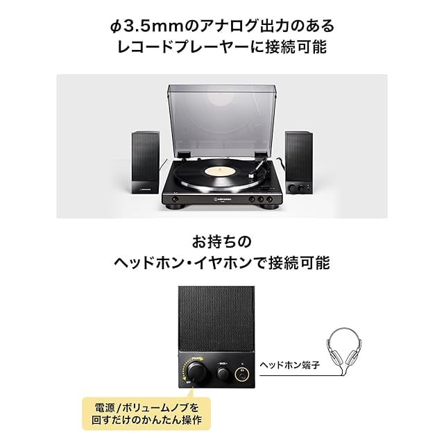 アナログ入力とヘッドホン出力に対応:付属の1.2m オーディオケーブルを使⽤して、φ3.5mm のアナログ出⼒のあるテレビやタブレット端末、レコードプレーヤーなどに接続可能。ヘッドホン端⼦を前⾯に搭載。深夜帯など⾳に配慮したい時に、ヘッドホンやイヤホンで楽しむことができます。また、ヘッドホン接続時の⾳量はスピーカー側で調整可能です。
