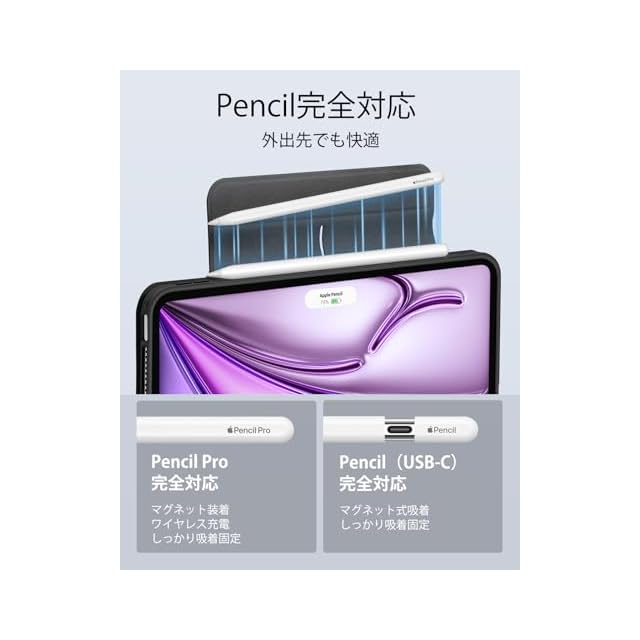 【Pencil Pro&Pencil (USB-C)対応】:Pencil Proへ完全対応かつ、磁気充電用の側面の溝と、Pencilをしっかりと固定するマグネットクラスプを備えています