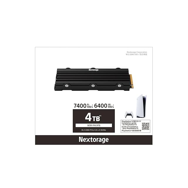 【製品仕様】Nextorage NEM-PAシリーズ PS5対応 ヒートシンク一体型SSD 4TB 最大転送速度(シーケンシャル):読み出し7,400MB/s 書き込み: 6,400MB/s インターフェース:NVMe (PCIe Gen4 x 4), フォームファクタ:M.2 2280 NANDフラッシュ:3D TLC