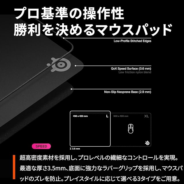 SteelSeries ゲーミングマウスパッド QcK Perf L - Speed プログレード設計 ネオプレンゴム ズレ防止 ステッチ縫い 長時間プレイでも快適 49cm×42cm×0.35cm 63430