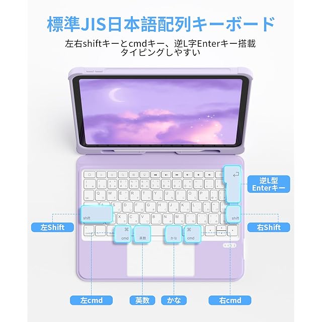 ✅【業界革新JIS標準日本語配列】ipad 10世代 キーボード はJIS規格準拠の日本語配列を採用し、逆L型Enterキー、左右shiftキー、左右cmdキー搭載、より快適にタイピングできます。また、キーが静音性に優れた素材を採用し、静音性を70%アップしました。安静なカフェや図書館などでも周囲を気にせず利用できます。