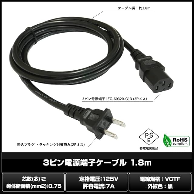 分類:電源ケーブル<br>定格電圧:125V<br>許容電流:7A<br>電線規格:VCTF(ビニルキャブタイヤコード)<br>芯数(芯):2<br>導体断面積(mm2):0.75<br>外被色:黒<br>入力端子:差込プラグ トラッキング対策済み(2Pオス)<br>出力端子:3ピン電源端子 IEC-60320-C13 (3Pメス)<br>重量(本体):約145g<br><br>:商品到着後、1年間の品質が付いております。<br>万が一品質に問題があった場合は、メールにてご連絡ください。<br><br>【ご注意】<br>アース端子を接続することは出来ません。<br>他社製品との互換性に関してはお答えしておりません。<br>期間内でも、仕様以上の過負荷による不具合に関しては対象外となります。<br>1年の適用条件は通常と同等になります。
