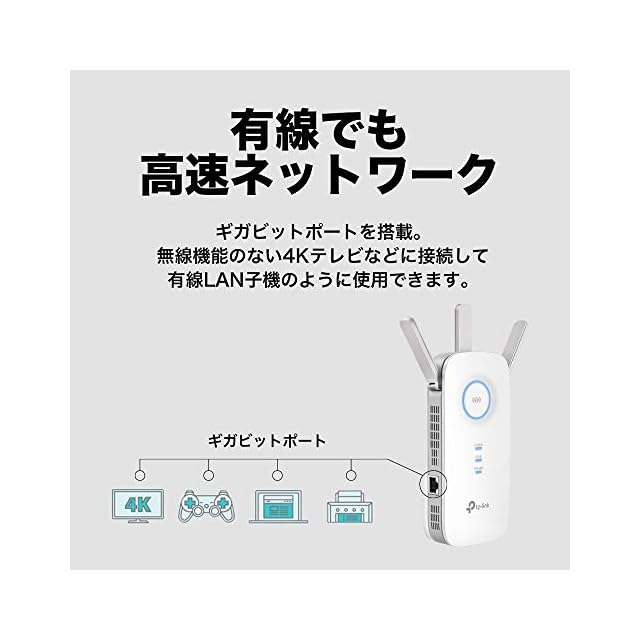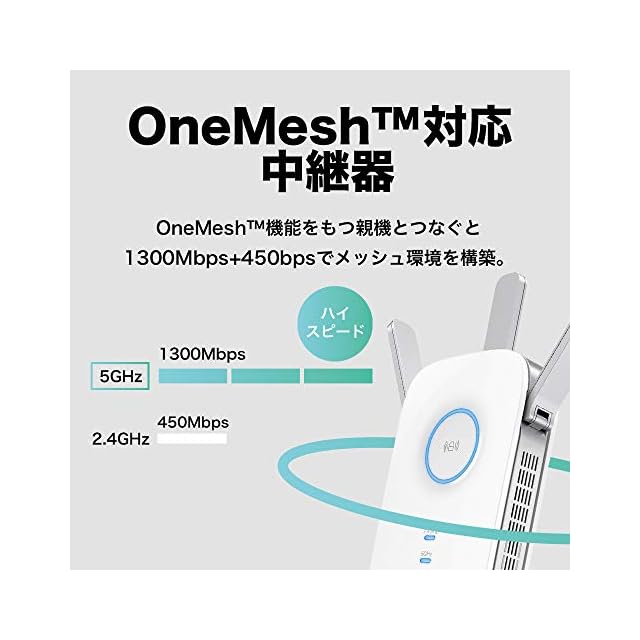 特徴:1300Mbps + 450Mbps、デュアルバンドで無線LANを中継。ギガLANポート搭載。Wi-Fi空間を鉄壁に。