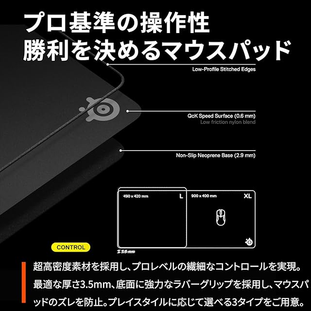 【プロ基準の操作性。勝利を決めるゲーミングマウスパッド】超高密度素材を採用し、プロレベルの繊細なコントロールを実現。プレイに最適な厚さ3.5mm、底面に強力なラバーグリップを採用し、マウスパッドのズレを防止します。プレイスタイルに応じて選べる3タイプをご用意。