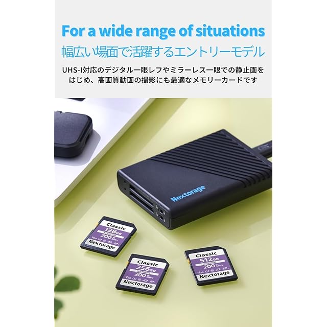 最大読出し速度:200MB/s ※注1:Nextorage デュアルスロット SDカードリーダー「NX-DF1CL」を使用した場合、注2:ご使用の環境により読出し速度は異なる場合がありますので予めご了承ください。