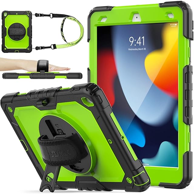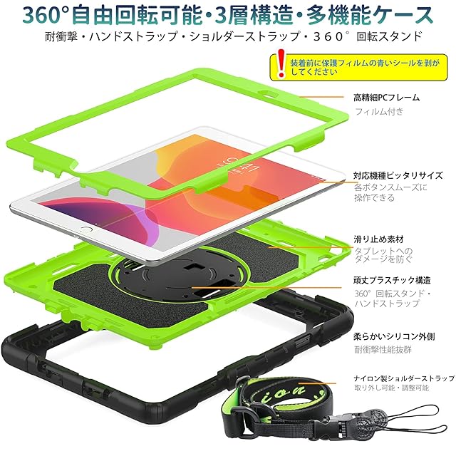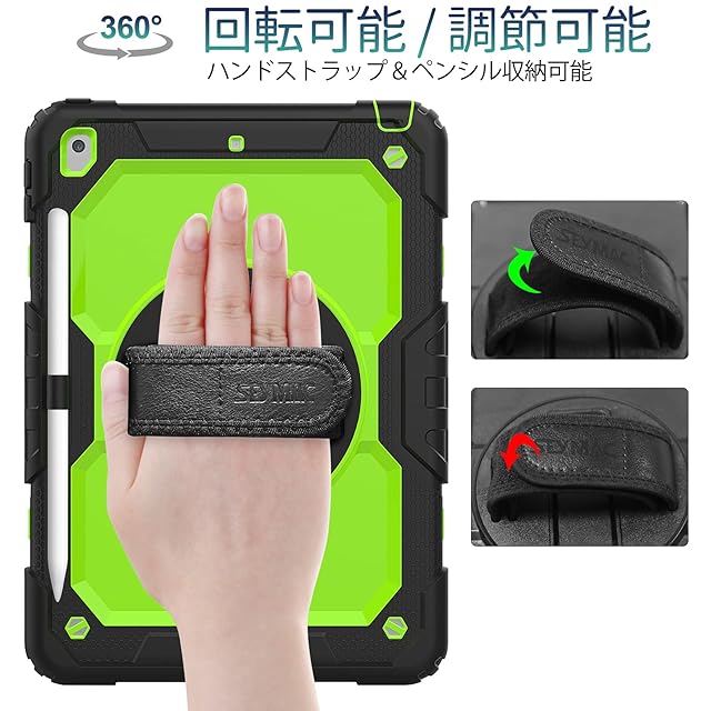 SEYMAC stock iPad 10.2インチ 第9世代/第8世代/第7世代 ケース 耐衝撃 保護フィルム付き ペン収納 360°回転スタンド ハンドストラップ ショルダーストラップ 全面保護カバー (グリーン+ブラック)