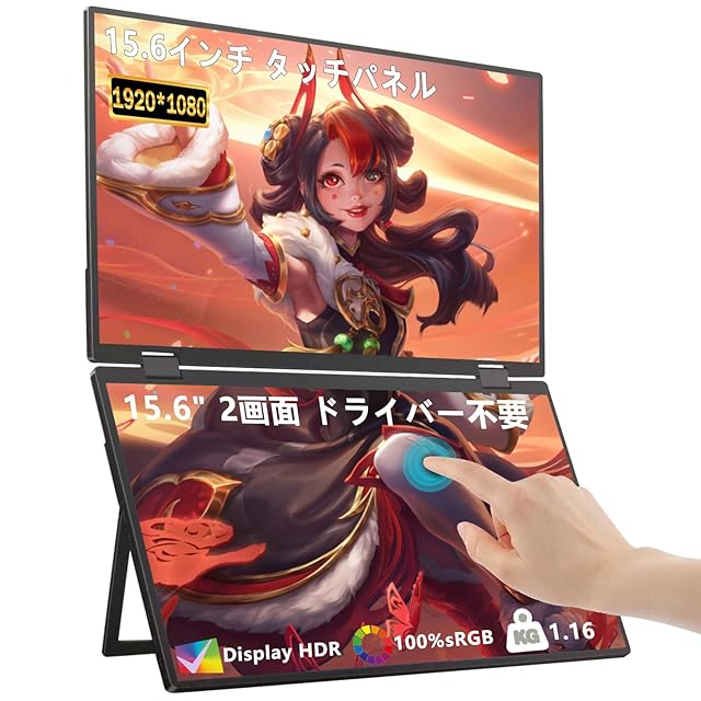 デュアル モバイルモニター 15.6インチ モバイルモニター タッチパネル フルHD(1920x1080)解像度 上下2画面拡張 折りたたみ式 デュアルディスプレイ VESA対応 100%sRGB 内蔵スピーカー 自立スタンド付き フル機能Type-C/HDMI ドライバー不要