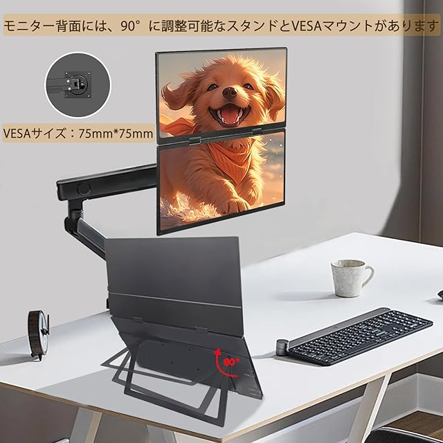 【多機能な表示モード】モニターは、複製モード、拡張モード、セカンドスクリーンモードをサポートしており、自宅でもモバイルワークでも、仕事の効率を上げることができます!ゲーム、ビデオ視聴のニーズに応えます。VESA穴は2つもあり、VESAアームに揺れなく取り付けられます!スタンド付きなので、0°から45°まで自由に調整できます!