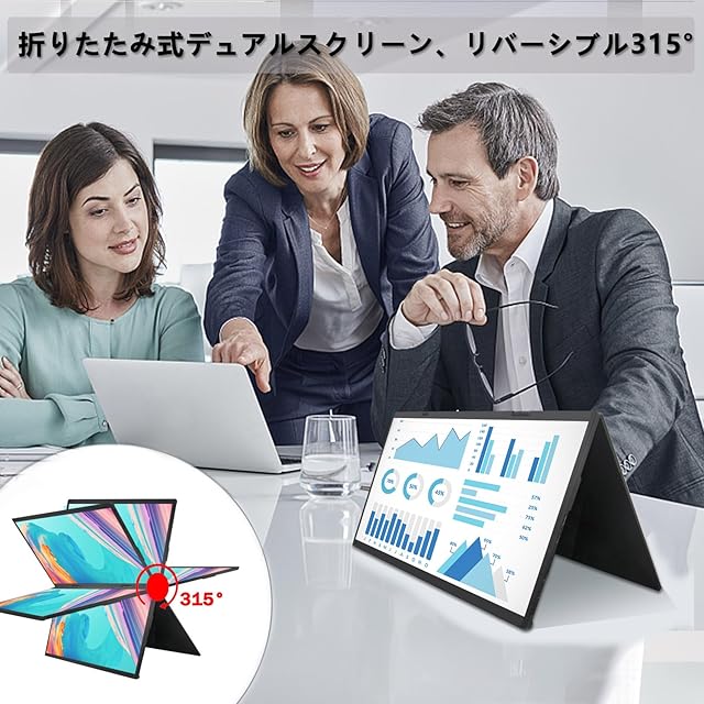 【人間工学に基づいたデザイン】315°の折りたたみ式デザインで、スクリーンの角度を自由に調整できます,向かい合っている人が見やすいようにすることで、視認性が高まり、内容共有が簡単になります。0°から90°まで自由に調整できる自立スタンド付きです!VESA穴が4つあるので、VESAアームに取り付けてもぐらつきません!