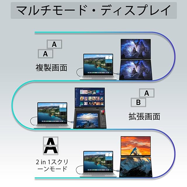 【上下のデュアルスクリーン設定は】モバイルモニターは178°の視野角を持つIPSパネルを採用しており、どの角度からでも鮮明な画像やビデオを視聴できます。十分なFHD(1920*1080)解像度を持ち、アスペクト比:16:9をサポートし、100%sRGB色域、コントラスト1000:1、300cd/m2の明るさで。