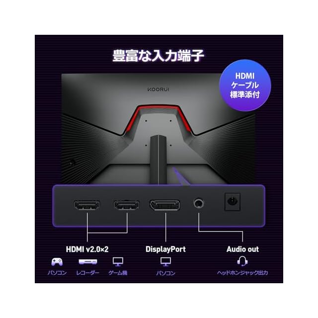 【商品説明】KOORUI G2411Pはeスポーツ特化の24インチ ゲーミングモニター。200Hz高リフレッシュ&AdaptiveSyncデュアルエンジンで画面乱れを解消、1ms応答速度で遅延ゼロ。IPSパネル+HDR400対応で暗部の敵視認性が向上。90% DCI-P3色域で戦場の色彩を忠実再現。※スピーカー非搭載