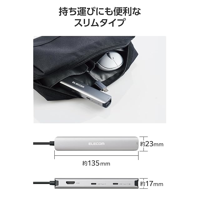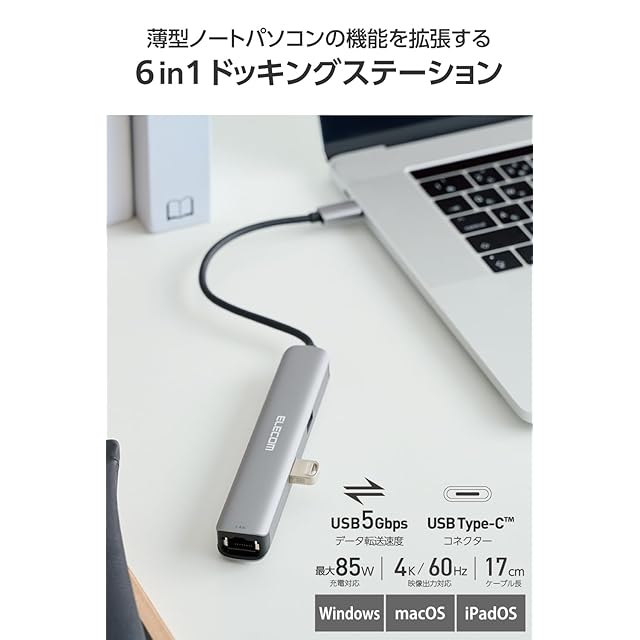 6ポートをスティックサイズに。薄型ノートパソコンの機能を拡張する、USB Type-C(TM)接続ドッキングステーションです。映像出力ができるHDMI(R)、インターネットの有線接続が可能なLANポートを備えながら、持ち運びに便利なスリムな形状を実現。USB Power Delivery対応で、パソコンに最大85Wまでスピード充電しながら周辺機器を使えます。