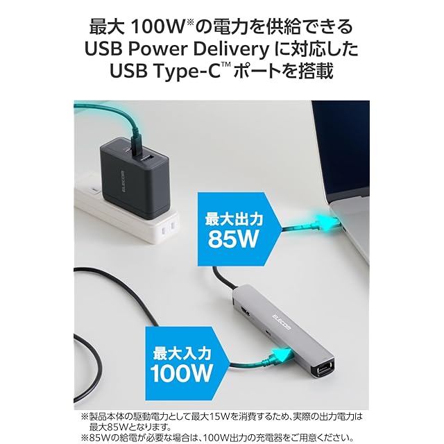 USB Power Deliveryに対応したUSB Type-Cポートを1ポート搭載しています。USB Type-Cコネクターを経由して最大100W(※)の電力をデバイス/パソコン本体に供給できます。