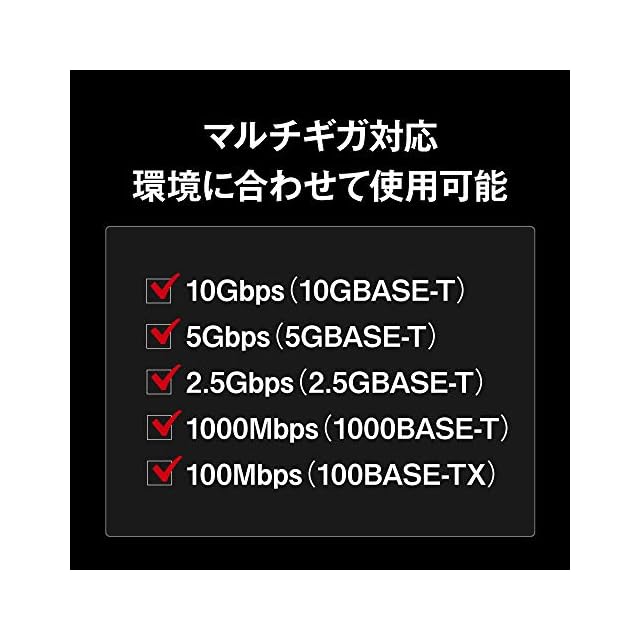 【規格】IEEE802.3an/802.3bz/802.3ab/802.3u準拠【伝送速度】100Mbps(100BASE-TX)、1000Mbps(1000BASE-T)、2.5Gbps(2.5GBASE-T)、5Gbps(5GBASE-T)、10Gbps(10GBASE-T)【ポート数】1ポート(AUTO-MDIX対応)【コネクター形状】RJ-45型8極コネクター