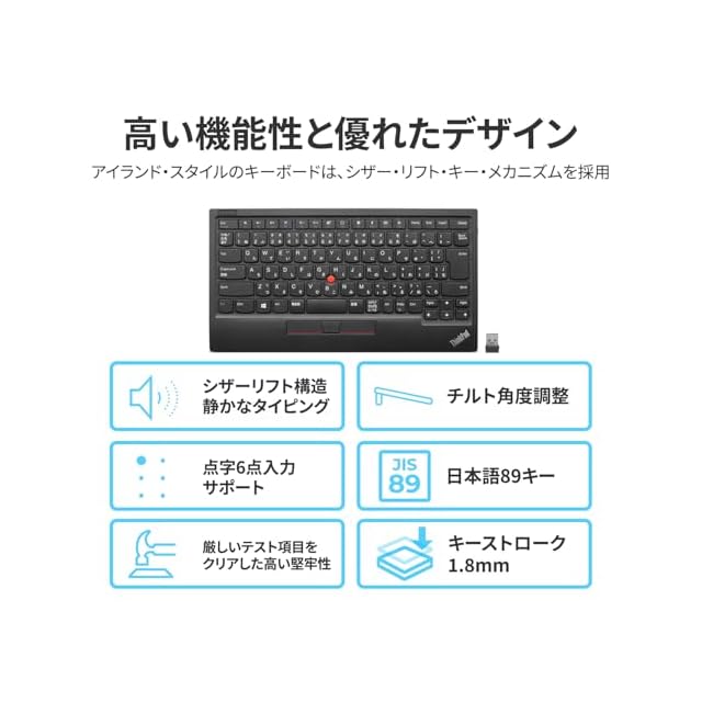 高さ12.39 mmの薄型、コンパクト設計でスペースが限られたデスクでもご利用いただけます/ 視覚障害者向けの6点入力サポート
